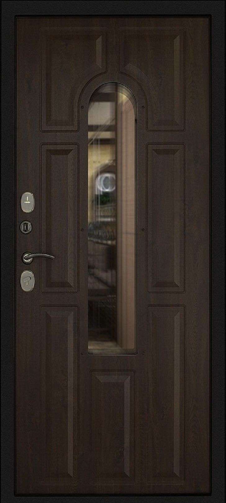 Внешняя отделка: МДФ-панель (10 мм) в цвете: "Темный орех" покрытие Винорит, трехкамерный зеркальный тонированный стеклопакет, декоративная ковка; окрас рамы порошково-полимерное покрытие "Черный";